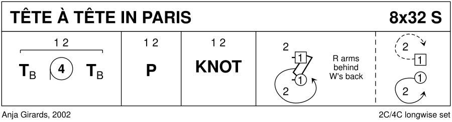 1-8 : 1s & 2s turn 2H (2 bars) into 4H round to left & turn partners 2H 9-16 : 1s+2s dance Diamond Poussette 17-24 : 1s+2s dance the Knot with 1M ending on Ladies side (L on M's on right) in "Backwards Prom hold" (LH normal & Mans RH behind Ladies back) 25-32 : 1s (in back-prom-hold) dance 1/2 Fig of 8 round 2M (LSh), dance up to top, split & cast to 2nd place own sides