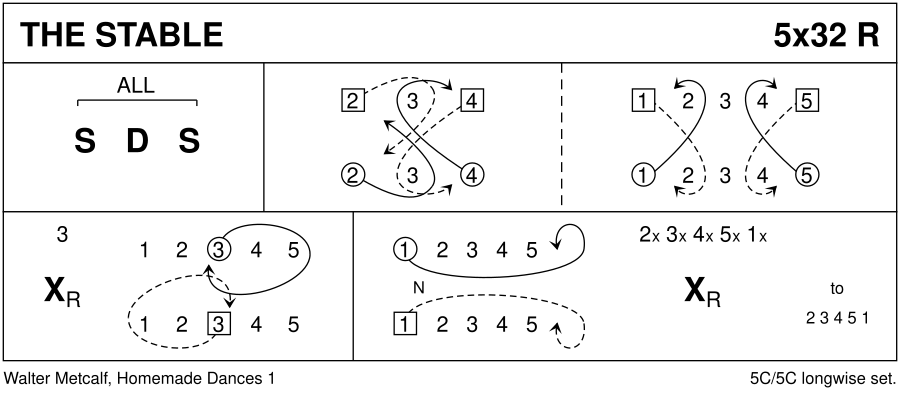 1– : All set | dance BtoB | set 9– : 2c+4c ½ DblFig8 round 3c (2c cast, 4c cross up) ; 1c & 5c ½ Fig8 round nearest C (cross to start) (1x,2x,3,4x,5x) 17– : 3c cross RH, cast R round end, dance in through the middle and pass Rsh into 3plx (1x,2x,3x,4x,5x) 25– : 1c dance to the bottom and cast to 5plx (other Cs up) | all cross RH (2,3,4,5,1)