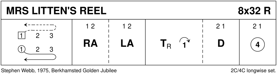 Mrs Litten was caretaker at Potten End Village Hall, where the Berkhamsted Strathspey & Reel Club has danced for many years: Mrs Litten was caretaker from July 1957 until her retirement in March 1975. This dance was dedicated to her as a reminder of the happy association that the club enjoyed with her over those years. On her retirement this dance was presented in a frame to Mrs Litten by the Children’s Class, who then danced it for her. The club ran a Children’s Class for many years in 1960s & 70s under the instruction of Colin Garrett, Rosemary Crawford and Stephen Webb.