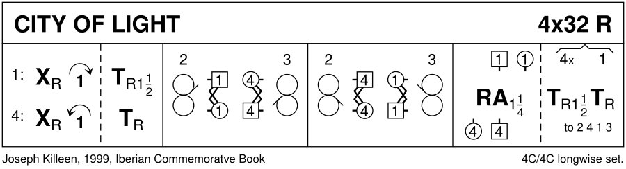 1-8 : 1s & 4s cross RH, cast in 1 place, 1s turn 1.1/2 RH as 4s turn RH once round to end in centre in prom hold, 1s facing up & 4s down (Lady on Man's Right) 9-16 : 1s & 4s dance reels of 3 across (1s LSh to 2M & 4s LSh to 3L) 1s+4s end passing RSh 17-24 : 4s & 1s dance reels of 3 across (4s RSh to 2L & 1s RSh to 3M) 25-32 : 4s+1s dance RH across & 1s turn partners RH once round as 4s turn 1.1/2 RH to end 2 4 1 3