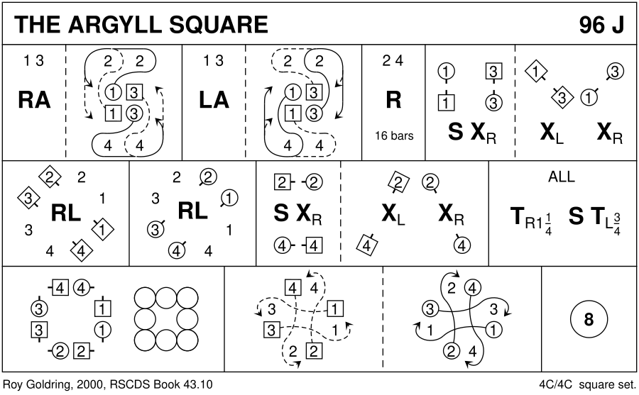 1– : 1c+3c RHA ; from the middle 1M/1W dance Lsh round 2W/2M and both cast L, 1W leading, to own places (3c doing likewise with 4c) 9– : 1c+3c LHA and repeat figure mirrored (1c/3c round 4c/2c, Rsh) 17–32 : 2c+4c repeat [1–16] (all to own places) 33– : 1c+3c set to P | change places RH ; 1W+3W change places LH | 1M+3M change places RH 41– : All W R&L on the diagonal, to start 1W change with 2W and 3W with 4W 49– : All M R&L on the other diagonal, to start 1M change with 4M and 3M with 2M 57– : 2c+4c repeat [33–40] 2M+4M remain facing out (to 3,4,1,2, M facing out) 65– : All C turn RH 1¼ (W finish backs to centre) ; set to P | turn LH ¾ to face cnr 73– : All dance interlocking Reels4 (round cnr Rsh, pass P Lsh, round other cnr Rsh, the M finish in place 81– : All W dance a curve in front of cnr and behind the M opposite to original place ; All M dance as curve in front of their new cnr and behind P to original place (1,2,3,4) 89– : All Circle8 and back
