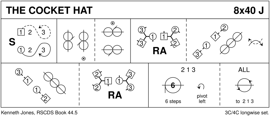 1-8 : 1s set & cast 1 place, dance down between 3s & cast up to 2nd place own sides 9-16 : 1s dance 1/2 reels of 3 across (Lady with 2s & Man with 3s) into 1/2 reel of 3 on opposite sides (3)(1)(2) 17-24 : 1s dance RH across (1M with 3s at top & 1L with 2s) & end facing 3rd crnr (pstn), 1s dance 1/2 diag RSh reel of 4 & pass RSh to face 4th crnr (pstn) 25-32 : 1s dance 1/2 diag reel with 4th corners & end in 2nd place own side, 1s dance RH across (1L with 2s at top & 1M with 3s) 33-40 : 2s+1s+3s circle 6H round to left for 6 steps, pivot & chase back to places