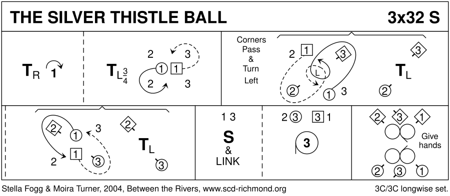1-8 : 1s turn RH, cast 1 place, 3/4 turn LH & cast to left to 2nd place own side 9-16 : 1s dance LSh Pass+Turn with 1st corners (cnrs also turn LH), turn LH & dance LSh Pass+Turn with 2nd cnrs & pass LSh to 2nd places 17-24 : 1s+3s Set+Link, 3M+2s (at top) also 3L+1s circle 3H round to left 25-32 : 2s+3s+1s dance reflection reels of 3 on own sides (3s out & up to start)