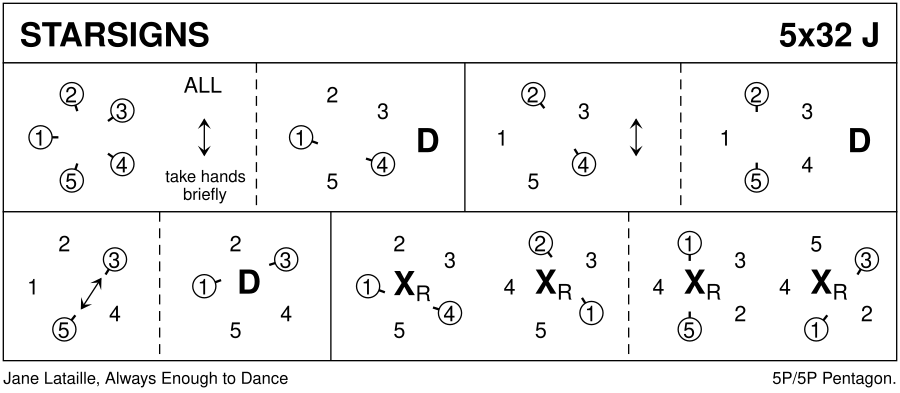 *5 dancers in circle pattern, 1 at top, 2,3,4,5 clw (1,2,3,4,5)* 1– : All advance, taking hands briefly | retire ; 1+4 dance BtoB 9– : 4+2 A&R ; 2+5 dance BtoB 17– : 5+3 A&R ; 3+1 dance BtoB 25– : 1+4 change places RH | 1+2 repeat ; 1+5 repeat | 1+3 repeat (4,5,1,2,3) *Deviser's note* : On bars 25–32, dancers should release hands early enough to reach new places.