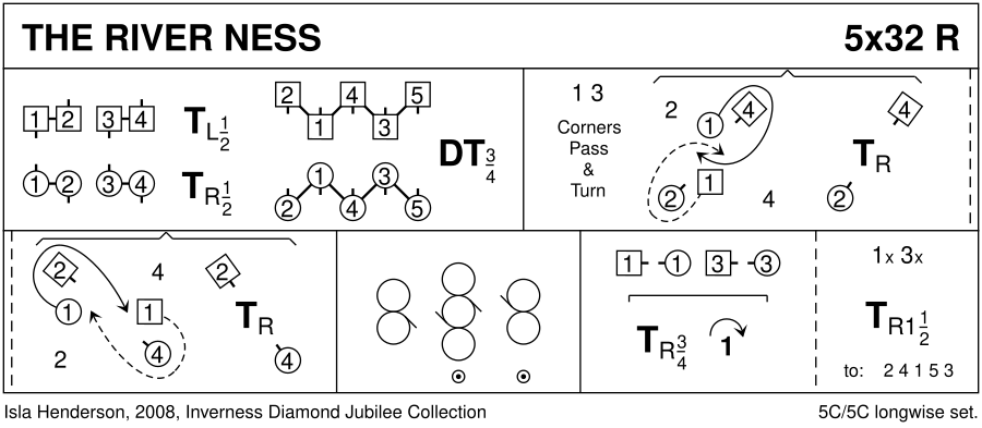 1-8 : 1s+2s & 3s+4s 1/2 turn (M RH, L LH) on sides (1s & 3s end BtoB facing own sides) & dance Double Triangles (6 bars) 1s/3s end facing 1st crnrs 9-16 : 1s & 3s dance Pass+Turn with 1st corners & pass RSh to face 2nd corners, 1s & 3s dance Pass+Turn with 2nd corners & end facing 4th corner 17-24 : 1s & 3s dance RSh reels across (1L+2s, 1M+4s+3L, 3M+5s) with 1s & 3s ending in line up/down middle facing partner (Men face up) 25-32 : 1s & 3s 3/4 turn RH & cast 1 place on opposite sides then turn RH 1.1/2 times to end 2 4 1 5 3