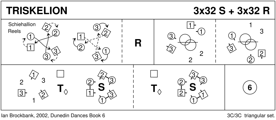 1– : 8 bars of Schiehallion Reels6 (3,1,2) 9– : 3c+1c ½ M-Chain ; (3W+1M)+2C ½ M-Chain 17– : All W Petronella turn to next W place on R | all set ; repeat [17–20] (2,3,1) 25– : Circle6 and back *repeat 2 times more in Strathspey time, 3 times in Reel time.*