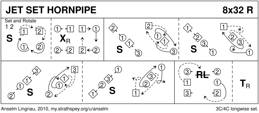 1–8 : 1C+2C set & rotate (1C fin facing 2cnr) 9–16 : 1C set to 2cnr | 1C cast RSh round each other to 4cnr position **while** 2cnrs dance into centre and swivel R to face own pl ; repeat, 2cnrs fin in exchanged places and 1C facing 3cnr 17–24 : Repeat pattern w/3cnrs, 1C fin in ctr (1W facing up, 1M down) and 1cnrs in exchanged places 25–28 : 1C dance RSh round 4cnr's pl to 2pl own sides **while** cnrs dance ½RL (starting up/down) 29–32 : 1C turn RH