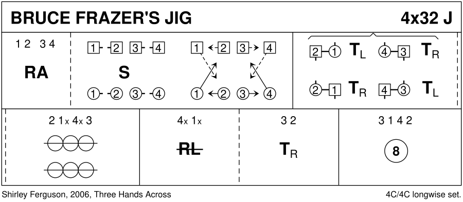 Bruce Frazer's Jig was devised to celebrate the many years Bruce has taught SCD classes in the Frimley Green area. The dance was originally called "Bruce Frazer's Farewell to Frimley Green", and was performed by the 'Badenoch Dancers' on 24th May 2006 at the farewell party to mark Bruce's move back to Scotland. The 'Badenoch Dancers' were a team which Bruce coached for competition at the Slough Arts Festival.