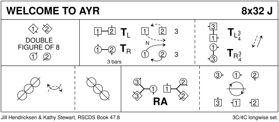 1-8 : 1s+2s dance double Fig of 8 (1s cross down to start) 9-16 : 1s turn 2s on sides (Men RH, Ladies LH) & 1s dance down to turn 3s on sides (Men RH, Ladies LH) & 1s end facing 1st corners 17-24 : 1s dance 1/2 reel of 4 with corners & pass RSh to face 2nd corner, 1s dance 1/2 reel of 4 with crnrs & 1s end in middle LSh to LSh facing own sides 25-32 : 1M+3s (at top) also 1L+2s dance RH across (1s end in 2nd place opposite sides), all chase clockwise 1/2 way to own sides