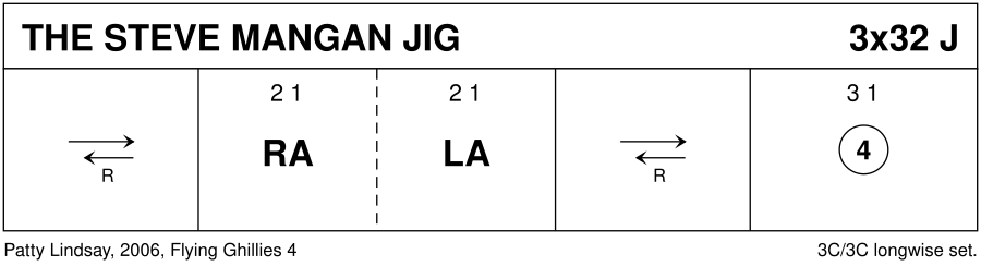 Suggested Recording: 3 x 32 Jigs, Track 11 on the album “Miss Ogilvie's Fancy” by Green Ginger On September 25th, 2006 the Flying Ghillies Scottish Country Dancers started a Scottish Country Dancing FUNdamentals class offered on the same night as the general class at the Mangan Banquet Center. Patty Lindsay taught this as the first dance in that class as a thank-you to Steve Mangan for working with us so that now the Flying Ghillies have a great hall to dance in with rooms for two classes.
