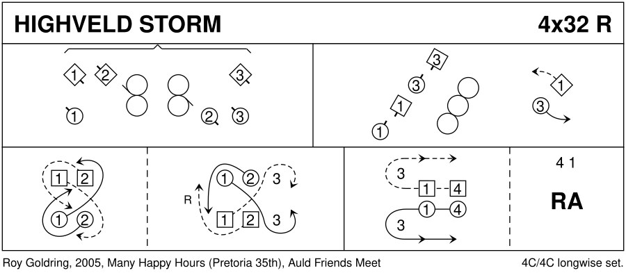 1– : 1c+2W & 2M+3c Reels3 across, to start 1c & 3c pass P Rsh, 2c finish in 2pl as 1W & 3M face P on 1diag. 9– : 1c+3c Reel4 on 1diag, on [15–16] 1W & 3M cast cclw to own place (1,2,3,4) 17– : 1c+2c ¾ DblFig8 | 2c cross RH as 1c cast to 3pl (3c up) (2,3,1,4) 25– : 1c, 4c following, dance up between 3c and cast off 2 ; 4c+1c RHA (2,3,4,1)