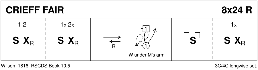 The movements of 1st couple on [15-16] have been much discussed, als on "Strathspey" in october 2013. A summary of the issue can be found at http://www.rscds.org/help/technique-panel-dances/199-crieff-fair.html, which says" Question Crieff Fair Bars 15-16. The wording in 101 SCD and the 1994 edition of book 10 differs from the recent compilation Books 7-12 (2009) which says "1st couple finish facing first corners, 1st woman turning under her own right arm". Does this mean 1st woman turns left about under their joined right hands using skip change of step rather than the pas de basque mentioned in an earlier publication? Answer Miss J. Milligan was very definite about pas de basque in 101 SCD but this can be considered a ‘private’ publication. Since then no RSCDS publications mentions pas de basque which would have been done if that had been the Society’s intention. In these circumstances both skip change or pas de basque could be considered acceptable. However, if teaching the dance today, the appropriate step to use would be skip change. Although previously agreed that the lady turned left about, the key phrase in the compilation books 7-12, “1st woman turning under her own right arm” means that she should turn clockwise or right about using skip change of step.