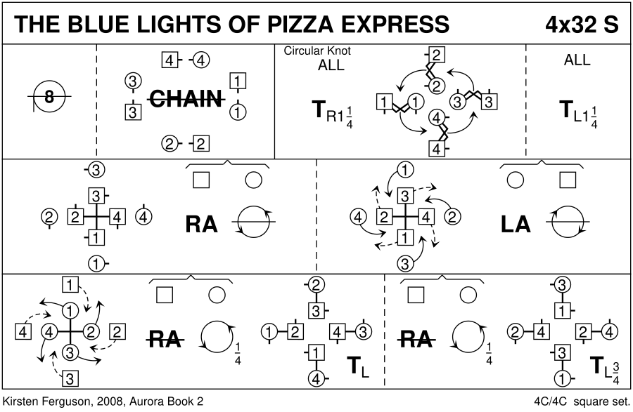 Devised by Kirsten Ferguson, who was asked for direction to a restaurant during the 2008 Inter Varsity Folk Dance Festival (IVFDF) in Sheffield. Friends were told to look for "The Blue Lights of Pizza Express" as their rendezvous point, and having enjoyed a very good pizza, Kirsten wrote this dance. [information taken from the 2nd Aurora Book of SCDs] As music the author suggests "any good traditional Strathspey".