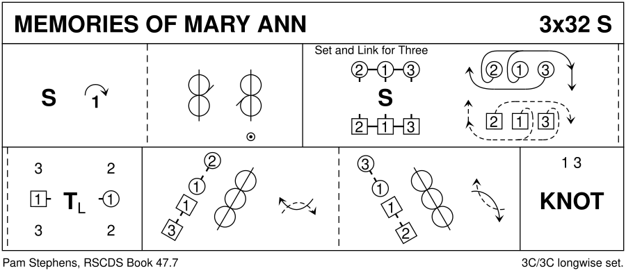 1-8 : 1s set & cast 1 place, 1s dance 1/2 reels of 3 across passing 1st corners LSh to start & 1s ending 2nd place opposite sides 9-16 : All Set+Link, 1s turn LH to face 1st corners (position) 17-24 : 1s dance 1/2 RSh diagonal reel of 4 & end facing 2nd corners (pstn), dance 1/2 reel of 4 with 2nd corners & end 2nd place own sides 25-32 : 1s+3s dance the Knot