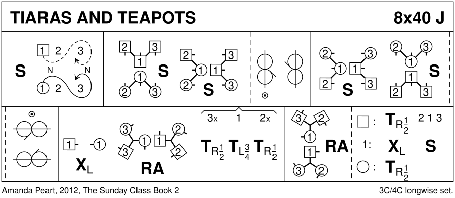 1-8 : 1s set, dance down & cast behind 3s (2s step up), dance up ending BtoB facing own sides 9-16 : 1s dance 4 bars "Crown Triangles" (1M+2M+3M then 1M+2s, 1L+2L+3L then 1L+3s). 1s pass 2nd corner RSh to dance 1/2 reels of 3 across. 17-24 : 1s dance 4 bars "Crown Triangles" (1M+2s then 1M+2L+3L, 1L+3s then 1L+2M+3M). 1s pass 1st corner RSh to dance 1/2 reels of 3 on sides. End 1L at top, 1M in 3rd place in middle 25-32 : 1s cross LH. 1M+3s (at top) also 1L+2s (at bottom) dance RH across. 1s turn 3/4 LH remaining in middle facing opp sides as 3s & 2s 1/2 turn RH 33-40 : 1M+3L+2L also 1L+3M+2M dance RH across. 1s cross LH to 2nd place own sides as 3s & 2s 1/2 turn RH on sides. 2s+1s+3s set