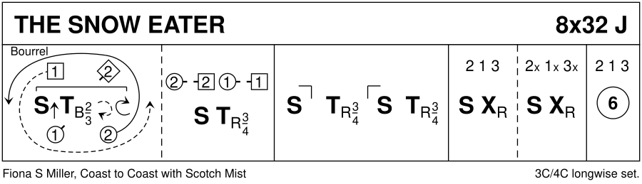 1– : 1c+2c dance the Bourrel, 1c finish facing 1cnr ; 9– : 1c set to 1cnr and face P | turn P RH to face 2cnr ; set to 2cnr and face P | turn RH to (2,1,3) 17– : All set and cross ; repeat 25– : Circle6 and back (2,1,3)