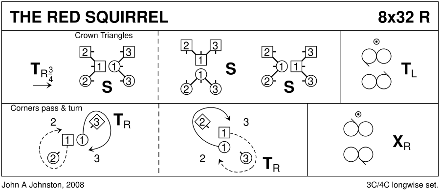 1-8 : 1s 3/4 turn RH to dance Crown Triangles & end facing 2nd corners 9-16 : 1s dance RSh reels of 3 on opposite sides & end turning LH to face 1st crnrs 17-24 : 1s dance Pass+Turn with 1st corners & pass RSh to face 2nd corners, Pass+Turn with 2nd corners & end facing 1st corners 25-32 : 1s dance LSh reels on the side & cross over to own sides