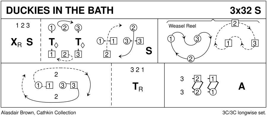 1-8 : 1s+2s+3s cross RH & set; 1s & 3s Petronella turn & set **while** 2s pull back RSh & cast, dance between 1st / 3rd couples to original places 9-16 : 1s+2s+3s dance Weasel reel: : 1s+3s dance part reel of 4 up/down middle but when reaching either end they dance clockwise to top/bottom to re-enter reel **while** 2s dance clockwise to replace dancer leaving the reel & all end where they started the reel 17-20 : 1M followed by 1L casts round 2L to 3rd place own side **while** 3L followed by 3M casts up round 2M to 1st place own side 21-24 : 3s+2s+1s turn partner RH, 2s+1s finishing in centre facing up in prom hold. 3 2 1 25-32 : 2s+1s dance Allemande. End 3 1 2