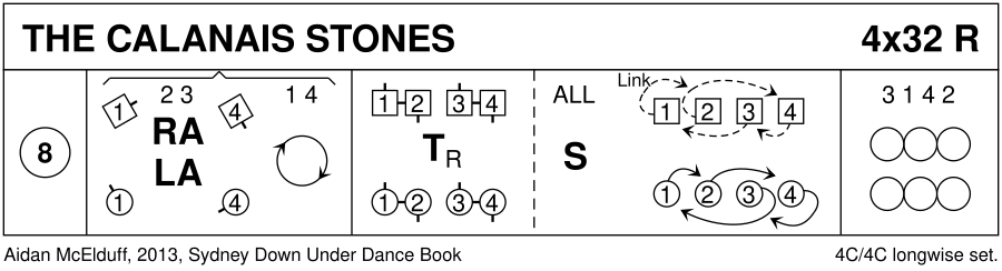 : 1c+2c & 3c+4c turn RH on sidelines ; “Parallel 4C S&Link“ [all set | on each sideline, the 2 leftmost dancers dance in, 1M(2M) to 2pl(4pl), 4W(3W) to 3pl(1pl), curving in round Rsh, the two rightmost cast R, 3M(4M) to 1pl(3pl), 1W(2W) to 2pl(4pl)] (3,1,4,2)