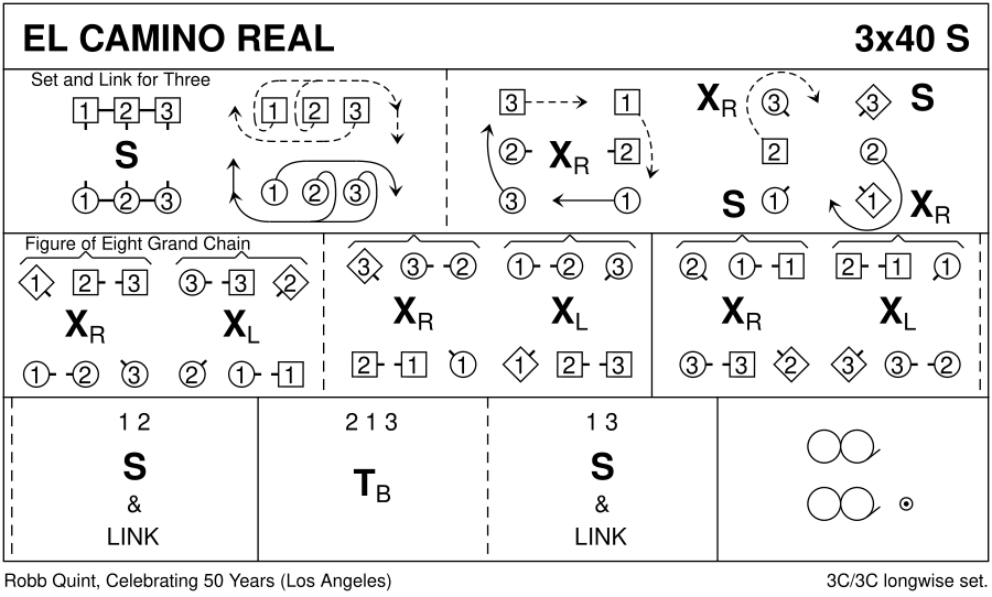 El Camino Real (The Royal Road) is the historic trail in California which is now approximated by U.S. 101, along which historic mission-bell markers have been placed. This route connects four of the Los Angeles Branch classes, from east to west Van Nuys, Thousand Oaks, Ventura, and Santa Barbara. Note: The figure-of-eight grand chain is precisely the same pattern as the figure in the dance Equilibrium, here in strathspey time two bars to a hand, but beginning with the dancers in different positions from Equilibrium. A good mnemonic for starting the figure is that the same two dancers who crossed diagonally in bars 7-8 are the ones who cross first diagonally in this figure.