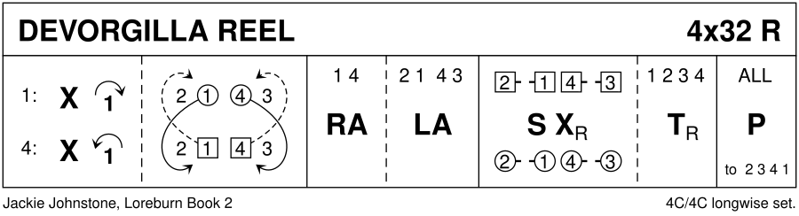 1-8 : 1s also 4s cross, cast in 1 place & dance 1/2 Fig of 8 round end couples 9-16 : 1s+4s RH across, 2s+1s also 4s+3s LH across ending in centre 1s facing 2s & 4s facing 3s 17-24 : 1s+2s also 3s+4s set, change places RH with opposite person & all turn partners RH 25-32 : All dance Poussette (for 4 couples)