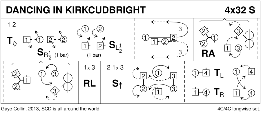 On bars 27 & 28 second and third couples need to make sure they are covering as they curve into place, to give this phrase a tidy finish as the first couple simply cast off into third place. This dance could also be done in a three couple set. With only one change the ending would now be: Bars 28-32 the first couple turn both hands 1½ times to finish in third place on own sides. My thanks to Lesley Campbell for her suggestion that third couple cast to enter the reel across (bars 9-16). The formation really does work much better this way. In 2013 Damon and I danced in Scotland for the first time. Our English base was in The Lake District where we stayed for a week in Chapel Stile. From there we drove to Kirkcudbright to dance on the last night of their season. We arrived late afternoon in this pretty, seaside spot and were welcomed by the gathering dancers and spent a very enjoyable evening in warm and pleasant dancing conditions. Later in the evening I exchanged our email address with Evelyn Thomas who was coming to NZ in 2014. We met up again then and danced together and shared a meal with both Evelyn & her husband, Ian. This dance was devised in memory of a very pleasant night in Kirkcudbright dancing with Evelyn and other dancers from that area.