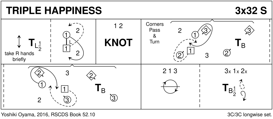 1–8 : 1C adv. 1step (take RH briefly)&ret. 1 step, half turn LH; cross down between 2C and cast up to place. 9–16 : 1C 2C dance the Knot - 1C end facing 1st corners. (2 1 3) 17–24 : 1C 1st corners Pass & Turn; 1C 2nd corners Pass&Turn. 1C pass Rsh to own sides. (corners turn BH) 25–32 : All dance cw to opp. side of set; all dance 1/2 turn (BH) and cast away. End on own sides. (3 1 2)