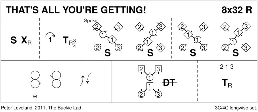 For Bill Forbes on the occasion of his 90th birthday. "That's all you're getting!" is one of Bill's stock expressions. When teaching at St. John's SCDC, Bill might occasionally say this immediately after a quick walkthrough or recap, at which point he would expect everyone to just dance the dance. It certainly encourages us to learn quickly, and proves to us (on most occasions) that we are able to just dance it. Recommended tune: <<ddt:Braes of Enzie, The#11344>> by Alister Forbes. Recorded music: Selection of Strathspeys found on CD Scottish Dance Country by Bobby Brown. Note the order of words ‘Scottish Dance Country’ is as written in dance instructions.