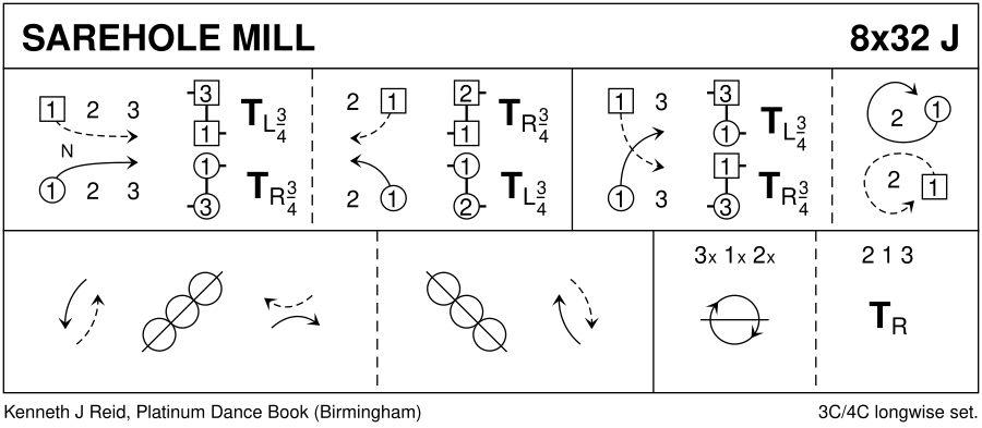 1– : 1c dance to between 3c | turn 3c EH ¾ (2c up) ; dance to top | turn 2c EH ¾ (2,1,3) 9– : 1c cross down to between 3c | turn 3c EH ¾ (to 2,1x,3) ; dance to top | cast to 2plx 17– : ½ Reel4 in 1diag, pass Lsh ; ½ Reel4 in 2diag, pass Rsh to 2plx (3x,1x,2x) 25– : All chase clw ½ ; All turn P RH (2,1,3)