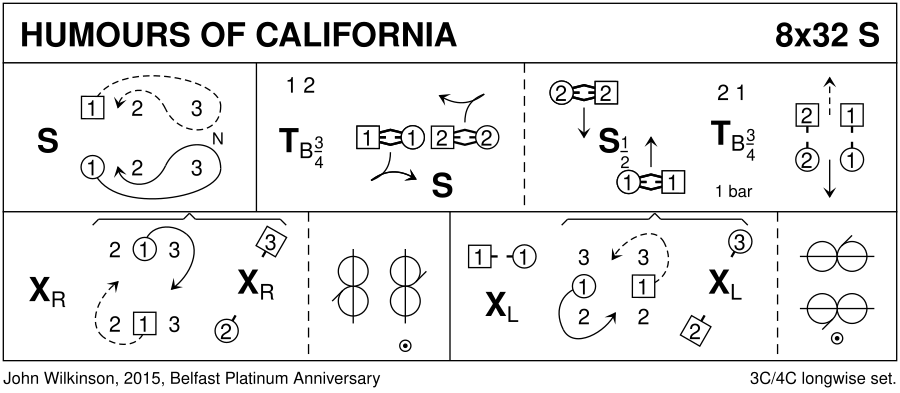 Devised by John Wilkinson June 2015. Dedicated to Marian Anderson and Max Ketchin on the occasion of their wedding. They live in the village of California, near Falkirk in Scotland. John kindly permitted the Belfast Branch to include the "Humours of California" strathspey in their 70th anniversary book.