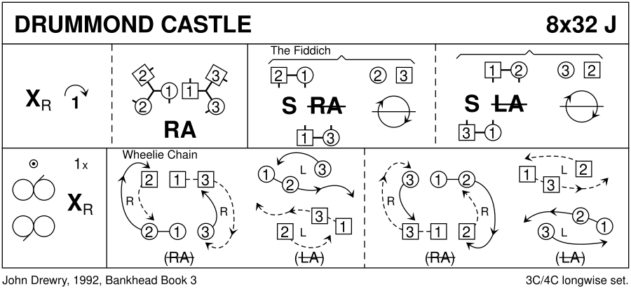 1-8 : 1s cross RH & cast 1 place, 1s dance RH across (1M with2s & 1L with 3s) 2(1)3 9-16 : 2s+1s+3s dance "The Fiddich": : 2M+3L chase clockwise to each others place **while** 1s with person on their right set advancing & dance RH across 1/2 way (3 1 2 on opposite sides) : Repeat but with 2L+3M chasing & 1s with person on left advancing & dancing LH across. 2(1)3 17-24 : 2s+1s+3s dance reels of 3 on sides (giving RSh to 2nd corner to start) & 1s end crossing RH. 2 1 3 25-32 : 2s+1s+3s dance "Wheelie Chain": : 1M dances 1/2 RH across with 2s as 1L dances 1/2 RH across with 3s, Men dance 1/2 LH across on Ladies' side as Ladies dance LH across on Men's side to end (3)(1)(2) all on opposite sides : Repeat to end 2 1 3 on own sides