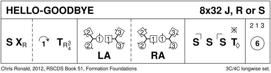 1-8 : 1s set cross RH, cast & turn 3/4 RH to face opp sides (2s step up 5-6) 9-16 : 1M+2s also 1L+3s dance LH across, 1s pass LSh to dance RH across with other couple. 1s end BtoB in middle facing 1st corners 17-24 : 1s dance 'Hello-Goodbye' setting, clap & petronella turn to 2nd place own side 25-32 : 2s+1s+3s circle 6H round & back