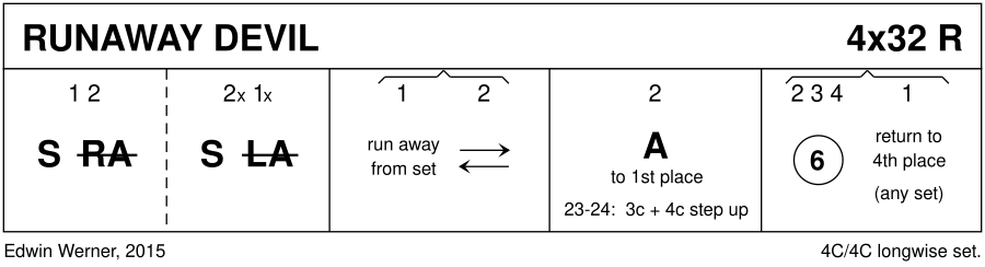 Deviser's note: 1st couple run away from their set and stand at the side of the hall where the dance event is being held. If desired, they may even leave the hall for a moment (this however depends on its size). This dance, based on The Deil amang the Tailors (RSCDS Book 14 no. 7), was devised for not fewer than four available sets on the dance floor.