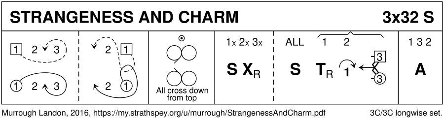 Although this dance really has nothing to do with quarks, I have noticed that the names of two of the six types of quark, “up” and “down”, appear frequently in the instructions for dances while two others, “top” and “bottom”, are seen occasionally. However the two most whimsically named quarks, “strange” and “charm”, are virtually never mentioned at all. So the title of this dance is an attempt to rectify that omission! Hopefully 1st couple will show each other some charm at least in bars 5-6 while bars 21-24 are probably a bit strange for everyone.