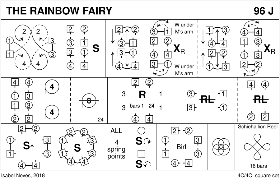 1-8 : 1s/3s cross partner NH into 1/2 Fig 8 (1M/3L round 4s, 1L/3M round 2s) End in lines across (3M+1L facing 2s, 3L+1M facing 4s) & all set 9-12 : 2s/4s make arch & change places with facing couple who change places, Lady dancing under Man's arm **while** 2s+4s change places RH 13-16 : 2s/4s dance under arches made by side couples & change places, Lady dancing under Man's arm **while** 1s/3s change places RH with partner 17-24 : 4s+1M+3L also 2s+1L+3M circle 4H round to left opening out into 8H round to left. 3 2 1 4 25-48 : 2s & 4s repeat 1-24 from new places to end 3 4 1 2 49-56 : 3s+1s (at top/bottom) dance 1/2 R&L; 4s+2s (side couples) dance 1/2 R&L. 1 2 3 4 57-64 : All NHJ with partner set advancing (little) to form circle & all set; all dance 4 Spring Points & set turning to face partner 65-72 : All birl with partner, ending back in square set, Men face in, Ladies face out 73-80 : All dance interlocking Men's Chain (Men LH across in centre). End Men facing in, Ladies facing out 81-96 : All dance Schiehallion reel, end facing partner