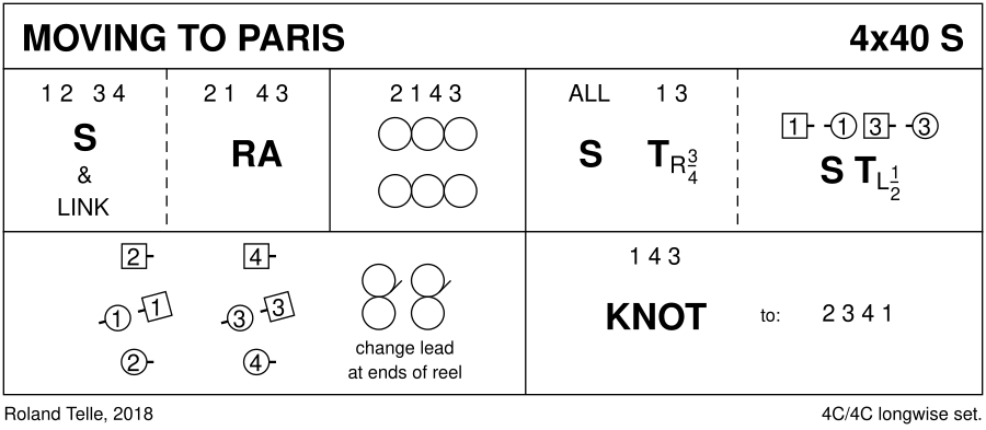 1– : 1c+2c & 3c+4c S&Link ; RHA (2,1,4,3) 9– : Reels4 on sides (2,1,4,3) 17– : All set | 1c & 3c turn P RH ¾ into midline, M(W) facing up(dn) | set to P ; turn P LH ½ into tandem facing up 25– : Parallel Reels3 in tandem across ( (with lead change), 1c(3c) LSh to 2M(4M) (2,1,4,3) 33– : 1c+4c+3c 3C Knot (2,3,4,1)