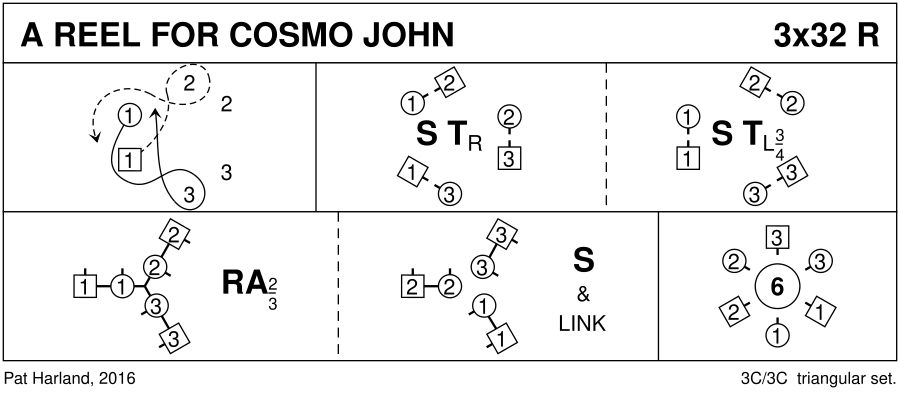 : All, NHJ with P, dance ⅔ RHA ; M drop RH & all, still facing clw, S&Link with P, turning slightly more to end on the sides (2,3,1)