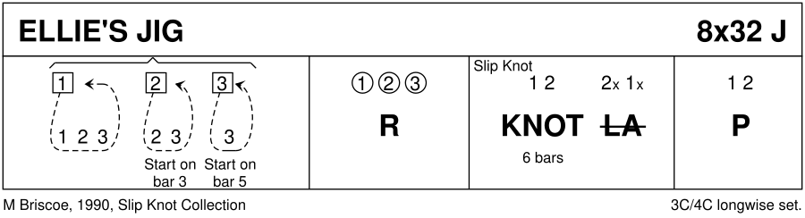 The dance, named for the devisor's wife Ellie, was first taught at the Lethbridge, Alberta, Workshop, April 6-8, 1990. The idea for the non-progressive Knot occurred simultaneously to Ellie and me while we were watching a Knot being performed one evening. An alternative name for the figure is the "Slip Knot."