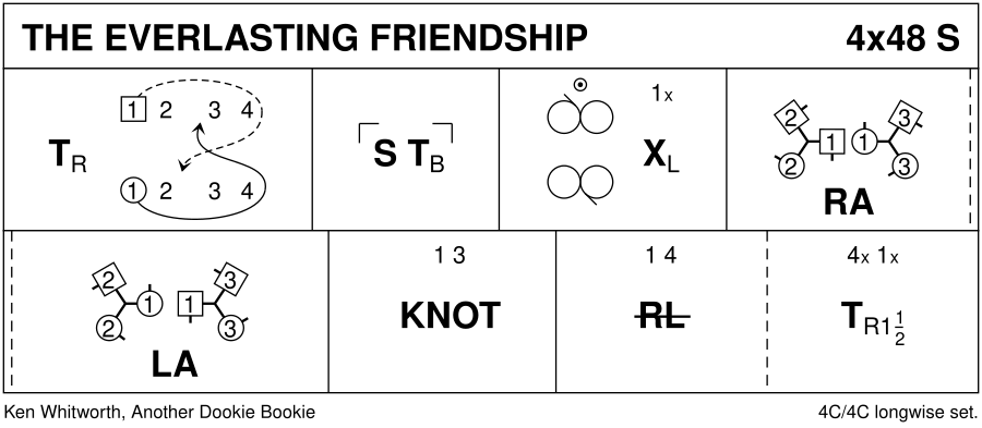 1-8 : 1s turn RH, cast down to bottom & dance up to face 1st corners 9-16 : 1s set to 1st corners & turn 2H, set to 2nd corner & turn 2H 17-24 : 1s dance reels of 3 on opposite sides giving LSh to 1st corner & end turning LH to … 25-32 : 1s dance RH across (Lady with 2s & Man with 3s, pass RSh & dance LH across with other couple 33-40 : 1s+3s dance the Knot 41-48 : 1s+4s dance 1/2 R&L & turn partners RH 1.1/2 times