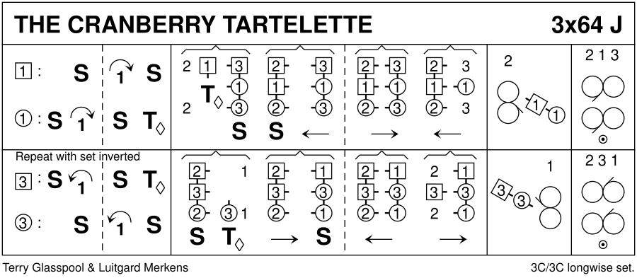 Luitgard Merkens (SCD Group Münster/Germany) came up with this adaptation of <<ddd:Cranberry Tart, The#9157>> by <<ddp:Glasspool, Terry#2677>> for a 3 couple set, inverting the set each time. After the first turn the progression is 2,1,3. The next turn has the original 3rd couple as dancing couple with 3rd woman starting, followed 2 bars later by her partner. This variation seems sufficiently popular to have its own dance entry.