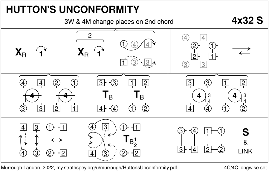 The dance starts with two chords. On the second chord 3rd woman and 4th man change places so that 1st and 2nd couples are facing their partner while 3rd and 4th couples are beside their partner. This dance commemorates James Hutton (1726-1797) one of Scotland's foremost scientists who is considered the founder of modern geology. He was one of the first to realise that weathering of rock formations showed the Earth was far older than was assumed at the time. Most famously he found several "unconformities" where strata of sedimentary rocks clearly overlaid older strata at a very different angle indicating that the older rocks must have been raised up from the sea bed, turned over so the strata were vertical, then sunk again and later covered with new sedimentary layers and raised up a second time. The cross, cast off and dance down figures indicate build up of the sedimentary layers (perhaps silt carried by rivers and falling to the sea floor). These are compressed when 1st and 2nd couples end closer together by bar 16 than at bar 9. The rock layers are turned in bars 17-24. The last figure has a hint of more sedimentation but is mainly oriented across at the top and up/down at the bottom like a typical unconformity. For more information about unconformities see <<https://en.wikipedia.org/wiki/Hutton%27s_Unconformity>>. One of the notable unconformities in Scotland is on the island of Arran. See <<http://www.arrangeopark.co.uk/wp-content/uploads/Walk_Leaflets/1.%20Hutton.pdf>> and <<https://www.scottishgeology.com/best-places/isle-of-arran/>>.