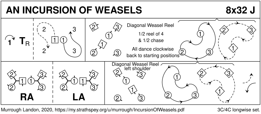 1– : 1c cast off (2c up) | turn RH to centre line facing own side ; ½ fig8 LSh round 4cnr to face 1cnr on diagonal 9– : All dance RSh diagonal Weasel reel: ½ reel4 on diagonal & chase ½ way clw via 2cnr pos to re-enter reel, corners end in same places, 1M ends below 1W on centre line 17– : 2c+1W & 1M+3c RHA, 1c pass RSh ; 2c+1M & 1W+3c LHA, 1c end facing 2cnrs 25– : All dance LSh diagonal Weasel reel with ½ cclw chase. 1c do not pass RSh on [32] but curve L to face out in 2pl (2,1,3) *After their 2nd turn 1c cast off as 4c step up on [1–2] of next repeat*