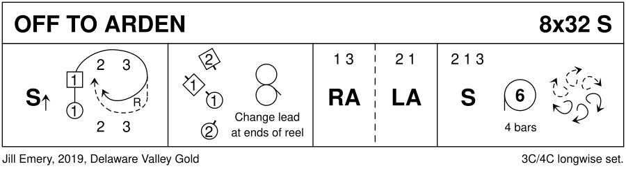 Jill and piper husband Dan Emery are renovating a house in the community of Arden (near Wilmington, DE), which is gathering a large number of dancers. The choreography loosely represents house-hunting, negotiations, and celebration. The first figure is a nod to the beginning of Jill’s dance Couples Meet, published in Delaware Valley Silver. The strathspey tempo echoes the lengthy moving process!