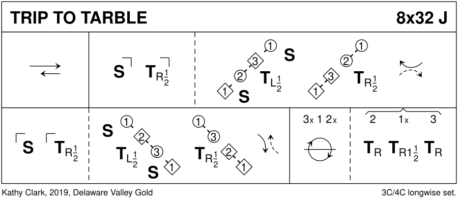 1–8 : 1s DMU to 2nd place facing 1st corners. 9–12 : 1s with 1st corners set and turn R ½. 13–14 : 1s set facing in while 1st corners turn L ½. 15–16 : 1s and 3rd corners turn R ½, 1s couple passing LSh to face 2nd corner diagonal. 17–22 : Repeat bars 9–14 with 2nd corners. 23–24 : 1s and 2nd corners turn R ½,1s passing LSh to end 3x, 1, 2x. 25–32 : All chase clw ½ round the set. 1s turn R 1½ while 2s and 3s turn R.