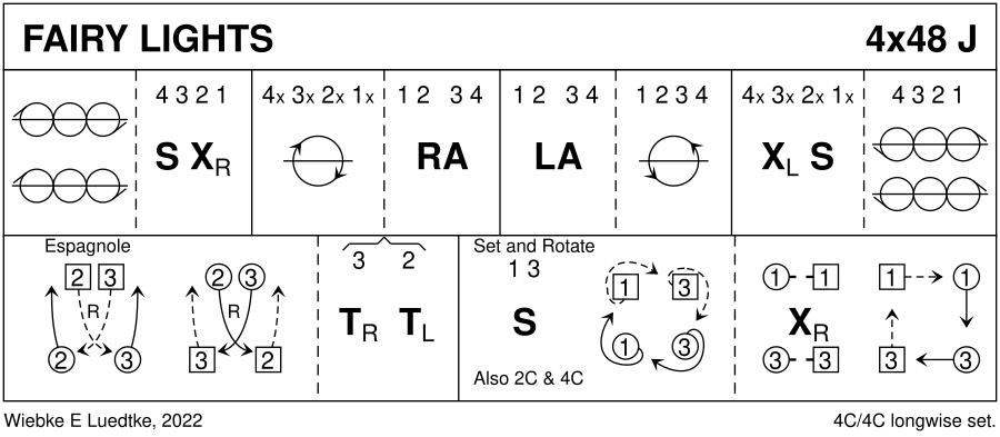 1– : ½ Rsh Reel4 on the sides | all set and cross RH 9– : ½ chase clw around the set | RHA at top and bottom 17– : “disentangle/retrace the steps”: LHA | ½ chase cclw around the set 25– : all cross LH and set | ½ LSh Reel4 on the sides 33– : 2c+3c Espagnole 41– : 1c+3c and 2c+4c Set&Rotate