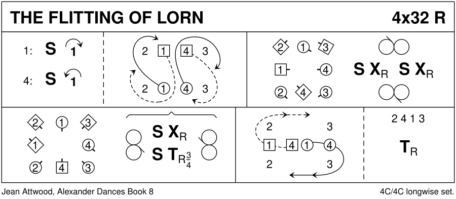 1-8 : 1s & 4s set & cast in 1 place (2s & 3s step down/up); 1M & 4L dance 1/2 Fig 8 round end couple (1M up, 4L down) **while** 1L & 4M dance across thru' partner's place & cast Right into lines across, 1L between 2s (top), 4M between 3s (bottom) 9-16 : 1M & 4L dance LSh reels of 3 on opp sides (1M down, 4L up) **while** 1L & 4M set facing up/down, change places RH, set change places RH to 1L facing 2L (top), 4M facing 3M (bottom) 17-24 : 1L & 4M dance RSh reels of 3 across (1L+2L & 4M+3M pass RSh) **while** 1M & 4L set facing across, change places RH, set, turn 3/4 RH to end 4L behind 1L facing up, 1M behind 4M facing down 25-32 : 1L followed by 4L chase out of top of set & cast to Right **while** 4M followed by 1M dance similar out of bottom of set to 2 4 1 3; All turn RH. 2 4 1 3