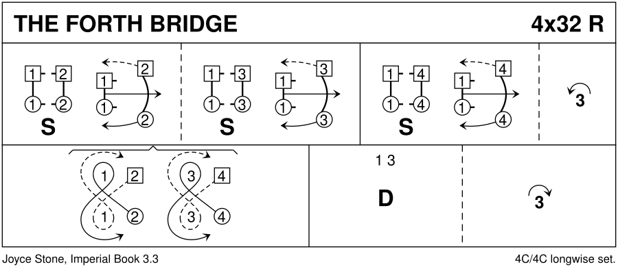 1-8 : 1s set to 2s on the sides both couples moving in, 1s dance under 2s arch to set to 3s, 1s dance under 3s arch 9-16 : 1s set to 4s & dance under 4s arch to 4th places facing out, 1s cast up to 1st places 17-24 : 2s dance Figs of 8 round 1s **while** 4s dance Figs of 8 round 3s 25-32 : 1s & 3s dance DoSiDo with partners, 1s cast to 4th places