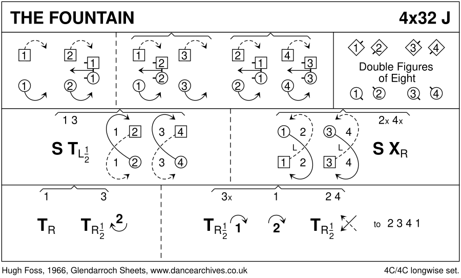 1-4 : 1s cast 1 place **while** 2s step up, 1s dance up **while** 2s cast 1 place 5-8 : 1s cast 1 place & dance up **while** 2s dance up & cast 1 place **while** 3s cast 1 place & dance up **while** 4s step up & cast 1 place 9-16 : 1s+2s also 3s+4s dance double Fig of 8 (1s & 3s cast to start) 17-24 : 1s & 3s set, turn LH, cross down & cast back to places **while** 2s & 4s continue with 1/2 Figs of 8, set & cross RH. 1 2 3 4 25-28 : 1s turn RH **while** 3s 1/2 turn RH & lead up to top 29-32 : 1s cast to 4th place **while** 3s 1/2 turn RH & lead up to top **while** 2s & 4s 1/2 turn RH & cross up. 2 3 4 1