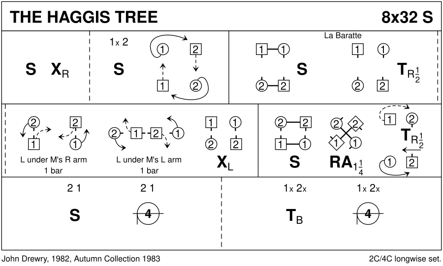 1-8 : 1s set & cross RH, 1s+2s set & 1L+2L cross to other sides **while** 1M casts down as 2M casts up (to right of other Lady) 9-16 : 1s+2s set & dance La Baratte : : Men 1/2 turn Lady RH & retains hand but at arm's length from each other : Men retrace steps with Lady turning right under Man's arm briefly into Allemande hold (Man behind Lady facing Ladies original place) & releasing Ladies RH she turns under Mans left arm until almost in original places : Couples change places LH to opposite places 17-24 : 1s+2s set, dance RH across 1.1/4 times round (4 bars), 1s dance out thru orig place & cast to 2nd place **while** 2s 1/2 turn RH to end 1st pl own side 25-32 : 2s+1s set, circle 4H round to left 1/2 way, turn partners 2H, opening out into circle 4H round to left to finish on own sides