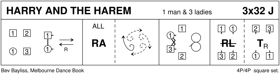 This dance is for 1 Man & 3 women in a square set ; clw M, 1W (together the “top”), 2W, 3W. It can also be danced in a “2- or 3-harem” longwise set.